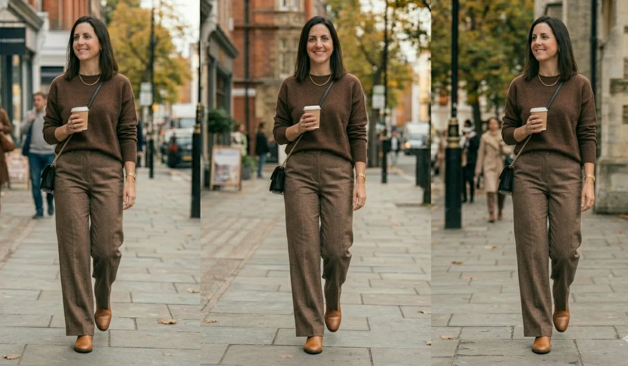 This is one of the cleanest looks you can put together. Take a fitted cashmere sweater in a neutral colour like camel, cream, or soft grey. Tuck it into wide-leg or straight tailored trousers. Add loafers or pointed-toe flats and you are done.